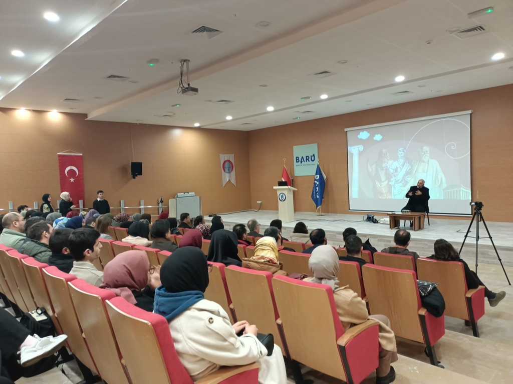 İslami İlimler Fakültesi Felsefe ve Din Bilimleri Bölümü tarafından 06.12.2024 tarihinde saat 10:00 BARÜ Rektörlük Konferans Salonunda Bursa Uludağ Üniversitesi İlahiyat Fakültesi Felsefe ve Din Bilimleri Bölümü Başkanı Prof. Dr. Kasım KÜÇÜKALP tarafından “Felsefenin Dünü-Bugünü: Felsefenin Yolcusu Olmak” konulu konferans düzenlendi. Yoğun ilgiyle takip edilen konferansta Kasım Küçükalp, Felsefe Tarihinin serüvenini anlatmış, Modern Dönem ile birlikte artık felsefenin, Hakikat’in ağırlığı karşısında beşerî idrakin konfor arayışına dönüştüğüne dikkat çekti.